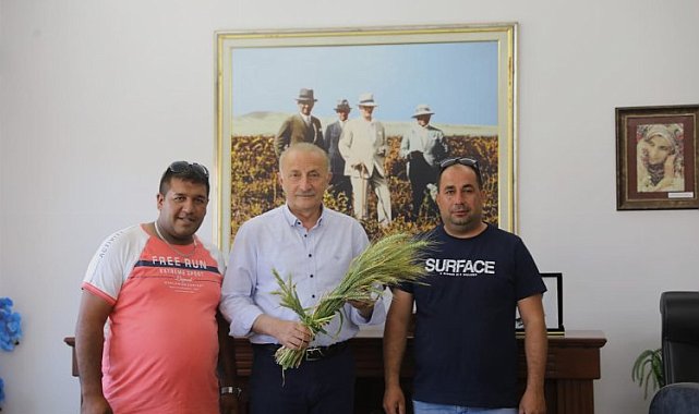 Didim Belediyesi tarafından 74 dönümlük araziye ekilen buğdayların hasat edilmesine sayılı günler kala ilk toplanan başaklar Didim Belediye Başkanı Ahmet Deniz Atabay'a hediye edildi.