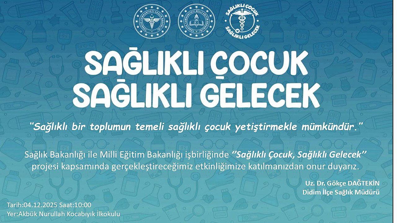 Sağlık Bakanlığı ve Milli Eğitim Bakanlığı ortak protokolü ile uygulamaya konulan "Sağlıklı Çocuk Sağlıklı Gelecek Eğitim Programı Projesi" kapsamında seçilen okulumuz Akbük Nurullah Kocabıyık İlkokulu'nda 4 Aralık 2025 Perşembe günü saat 10.00' da Didim İlçe Sağlık Müdürlüğü koordinesinde,öğrencilerimizle birlikte proje kapsaminda yapılacak etkinliklerde sizleri de aramızda görmekten onur duyarız.
